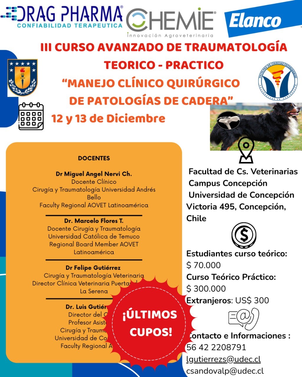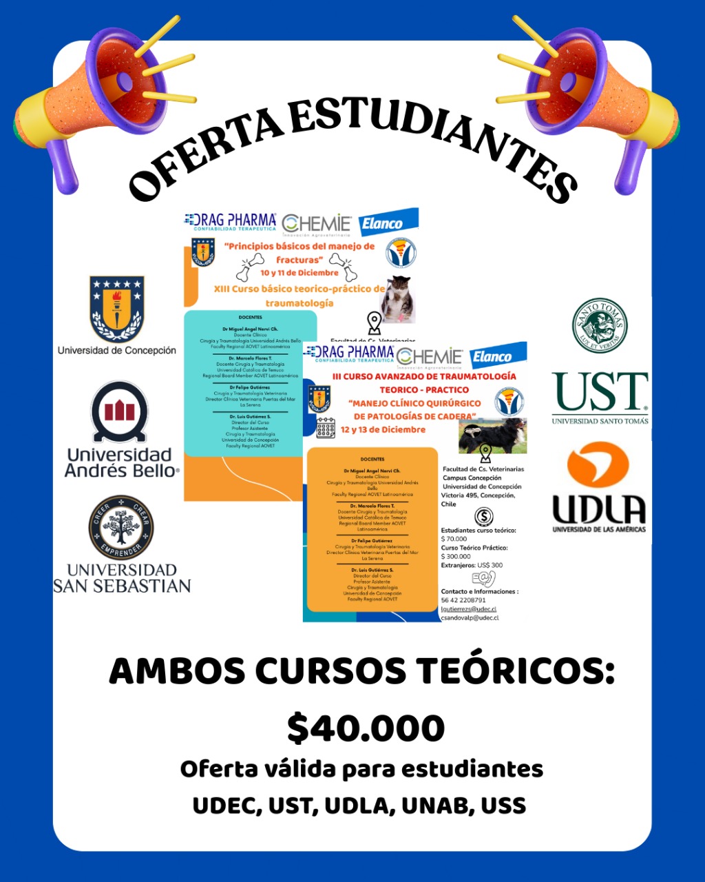 OFERTAS DE CURSOS DE TRAUMATOLOGÍA 28 Noviembre, 2025 Teresa Ossandon Sin categoría Estimados Estudiantes; Se informa por intermedio del Dr. Mario Briones L. Vicedecano de la Facultad C/V. En adjunto les presenta ofertas de Cursos Teóricos Básicos y Avanzados de Traumatología. Atte. Teresa Ossandón P.
